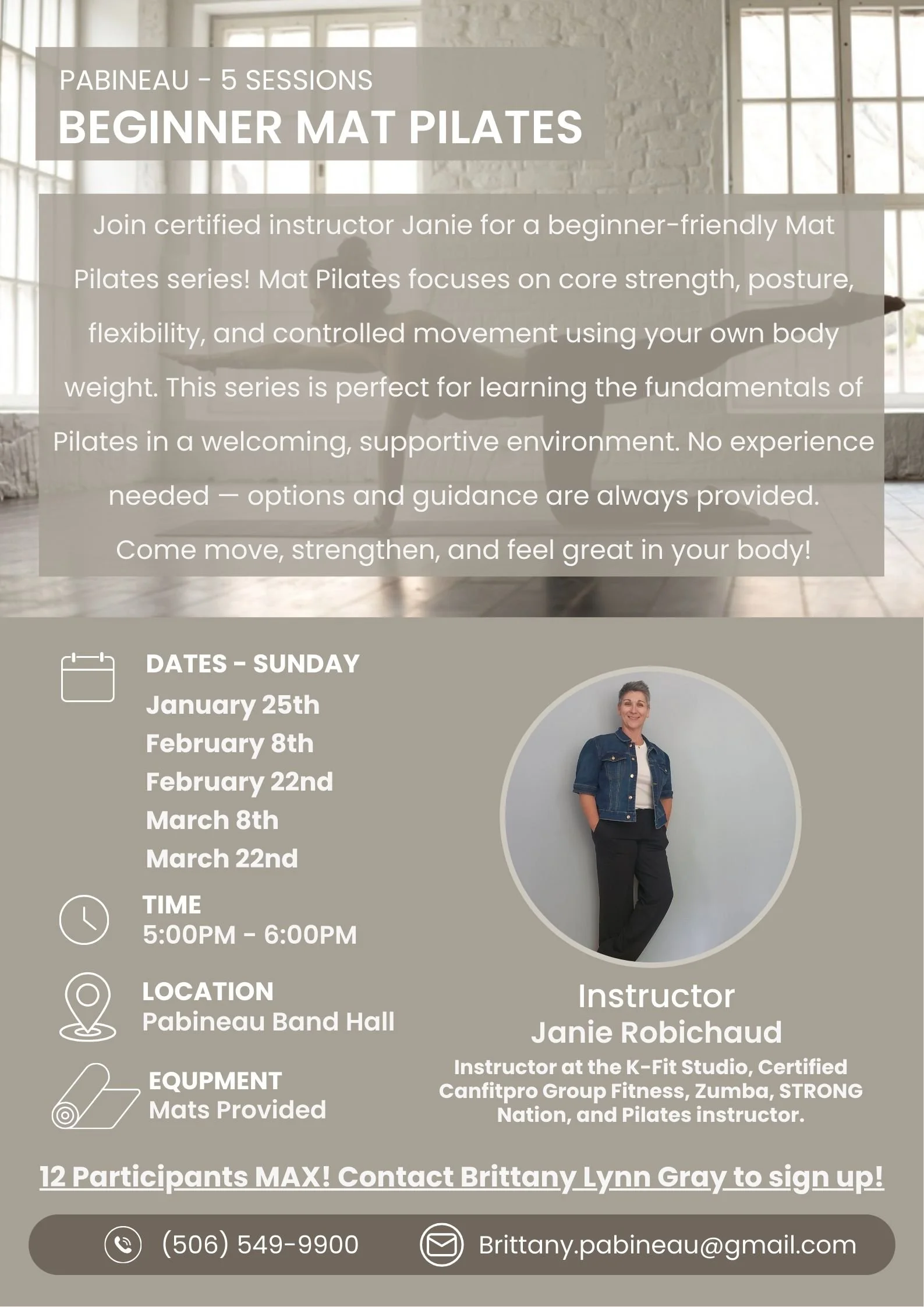 Pabineau is excited to offer a Beginner Mat Pilates series led by certified instructor Janie Robichaud. This beginner-friendly class is designed for anyone looking to build strength, improve posture, and move with more confidence—no prior experience required.