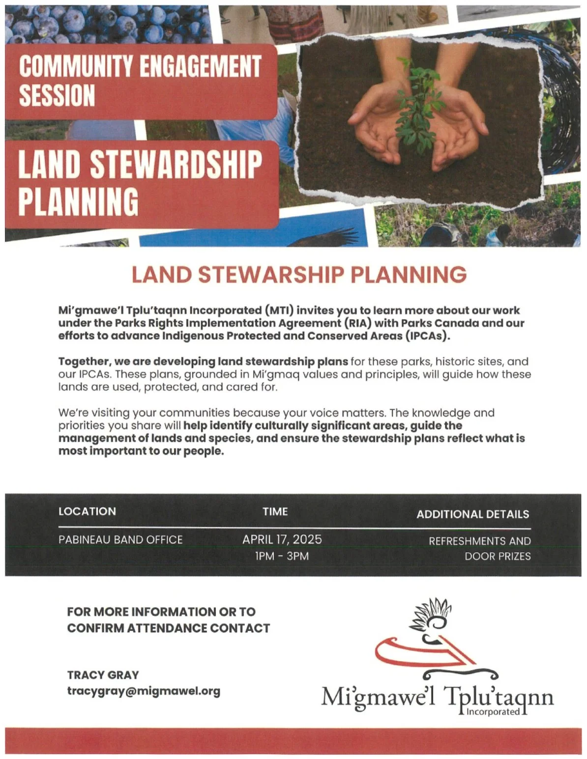 This image is the official event invitation from Mi’gmawe'l Tplu'taqnn Incorporated (MTI) for a community discussion on land stewardship and Indigenous Protected and Conserved Areas (IPCAs). The event will be held at the Pabineau Band Office on April 17, 2025, from 1 PM to 3 PM. Attendees will learn about developing land stewardship plans grounded in Mi’kmaq values, and provide input on managing culturally significant areas. Refreshments and door prizes will be provided.