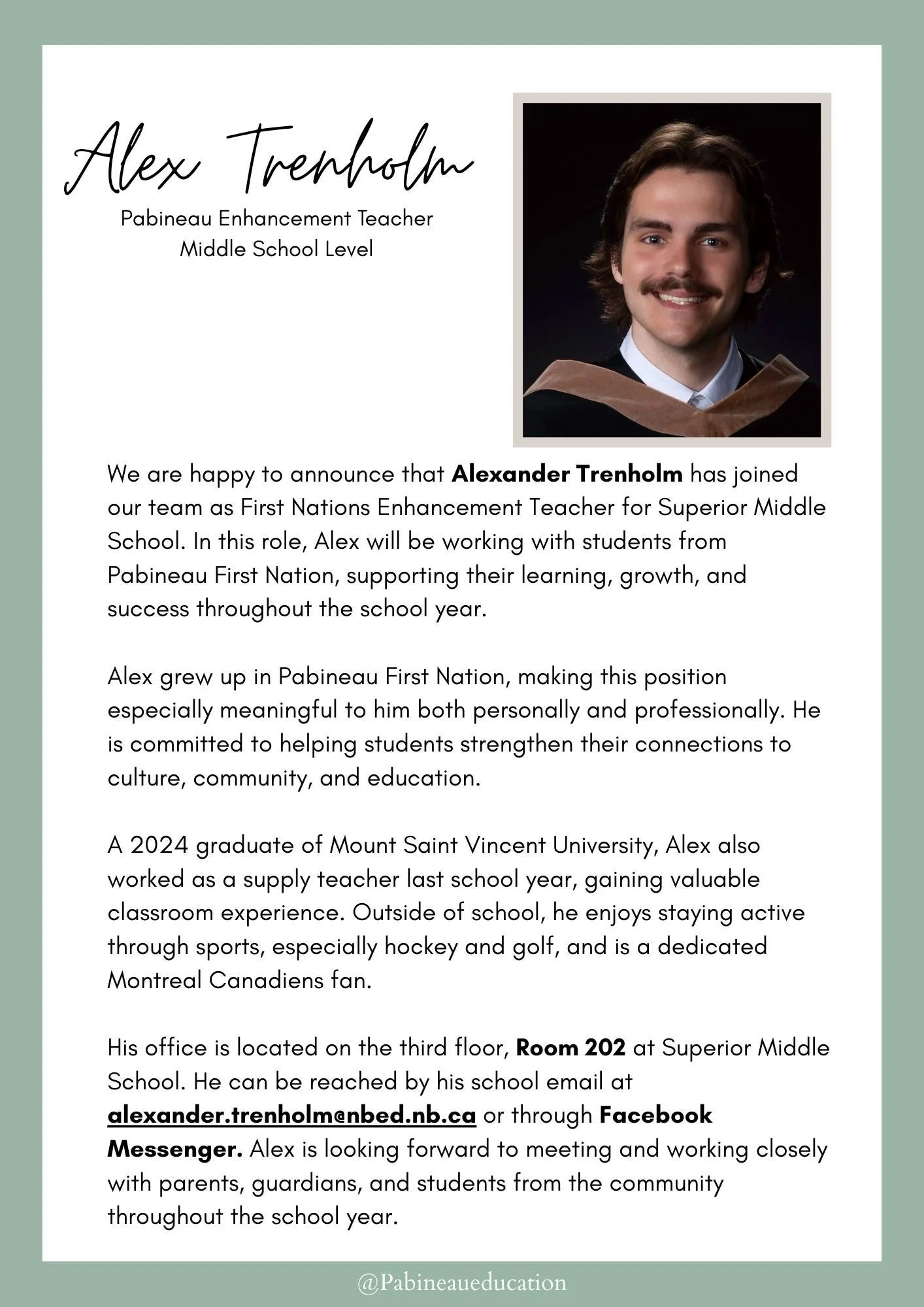 We are happy to announce that Alexander Trenholm has joined our team as First Nations Enhancement Teacher for Superior Middle School. In this role, Alex will be working with students from Pabineau First Nation, supporting their learning, growth, and success throughout the school year.